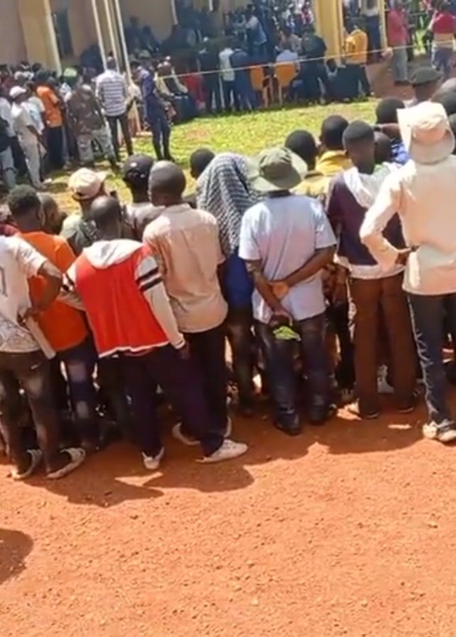 large crowd of people standing in front of a building, likely outdoors on a red-dirt ground. The crowd is composed of men and some children, many wearing casual clothing. A few individuals dressed in military-style camouflage uniforms with weapons are present. They appear to be overseeing or monitoring the crowd. There are other people in the background further away from the camera, and additional buildings are visible in the background. The scene appears to be outdoors, possibly in a public area.