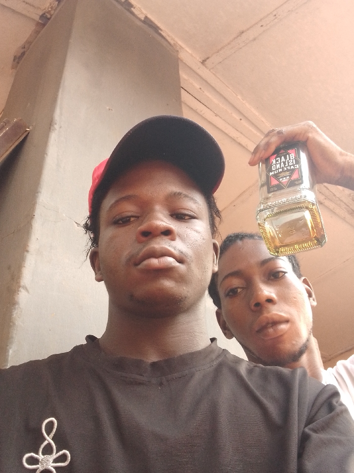 The image depicts two young adult males in a close-up, low-angle shot, situated within an outdoor or semi-outdoor environment in the city of Unknown, Unknown. A light gray concrete structure forms the background on the left, transitioning to a white wooden plank ceiling overhead and to the right. The prominent subject, positioned in the foreground and occupying the left two-thirds of the frame, is a male with dark skin, wearing a black baseball cap reversed to show a red underside, and a black crew-neck t-shirt adorned with a white, stylized knot emblem on the left chest. He has short, dark, textured hair, a thin mustache, and a faint goatee, maintaining a direct, neutral gaze at the camera. Behind and to the right of the primary subject, a second dark-skinned male is partially visible. He wears a light-colored t-shirt, has short dark hair and a short beard, and also looks directly forward with a neutral expression. The second individual's raised right hand grasps an inverted glass bottle, mostly empty, containing a small volume of amber liquid at its neck. The bottle's label, "BLACK ISLAND CAPE RUM," is partially legible.