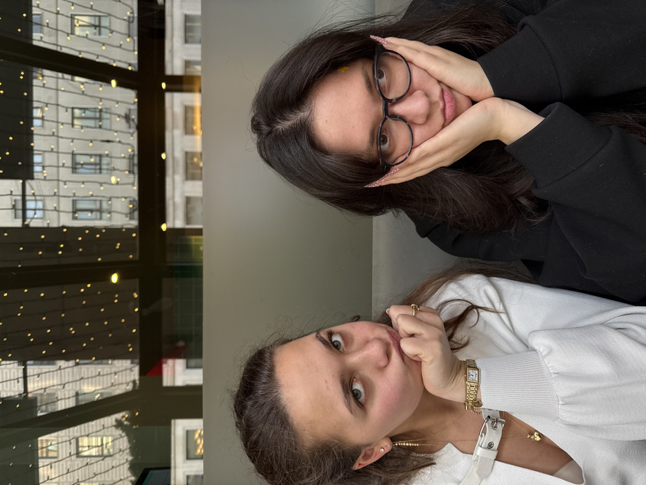 The image displays two young adult females seated side-by-side indoors, likely within a cafe or restaurant in the city of Milan, Italy. Both subjects are positioned facing the camera, exhibiting similar pouting or bored expressions. The subject on the left has light brown hair, partially pulled back. She is wearing a white, V-neck, long-sleeved top. Her accessories include gold-colored dangle earrings, a gold-colored ring on her right ring finger, a rectangular gold-colored wristwatch on her left wrist, and a gold-colored heart pendant on a chain around her neck. Her right hand is placed under her chin, supporting her jaw. The subject on the right has dark brown, straight hair, parted in the middle. She wears dark-rimmed eyeglasses, possibly with a tortoiseshell pattern, and a black long-sleeved top or hoodie. Her fingernails are long, pointed, and decorated with what appears to be glitter. A small yellow object or sticker is visible in her hair above her left temple. Both of her hands are cupping her cheeks, supporting her head. The women are seated against a light grey or beige upholstered bench. Directly behind and above them is a frosted or opaque glass partition. The uppermost section of the image reveals a large window or glass ceiling panel. This glass surface reflects an exterior urban environment, featuring a multi-story, light-colored building with numerous rectangular windows. Additionally, multiple small, yellow-orange circular lights, arranged in a grid pattern, are reflected in the glass, suggesting decorative string lights either inside the establishment or from the exterior.