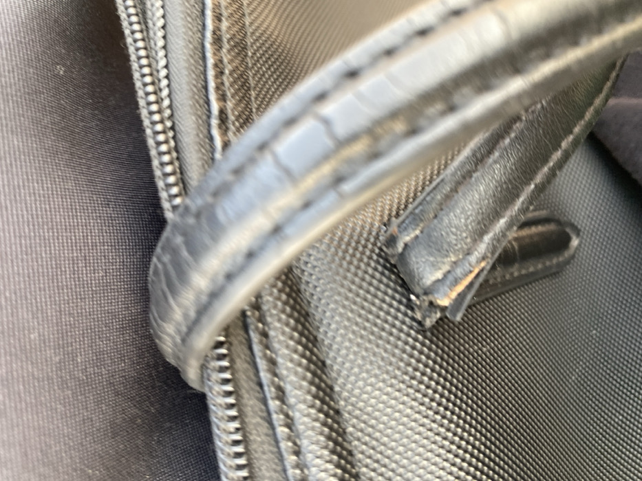 A close-up shows the worn handle of a black bag. The handle is made of textured black material, possibly leather or a leather-like substitute, and is attached to the bag with a strap. The stitching along the handle is visible. There's a zipper running alongside the bag. The handle shows signs of wear and tear, with the material starting to crack and peel away, revealing a lighter color underneath. The bag's material has a tight, woven pattern.