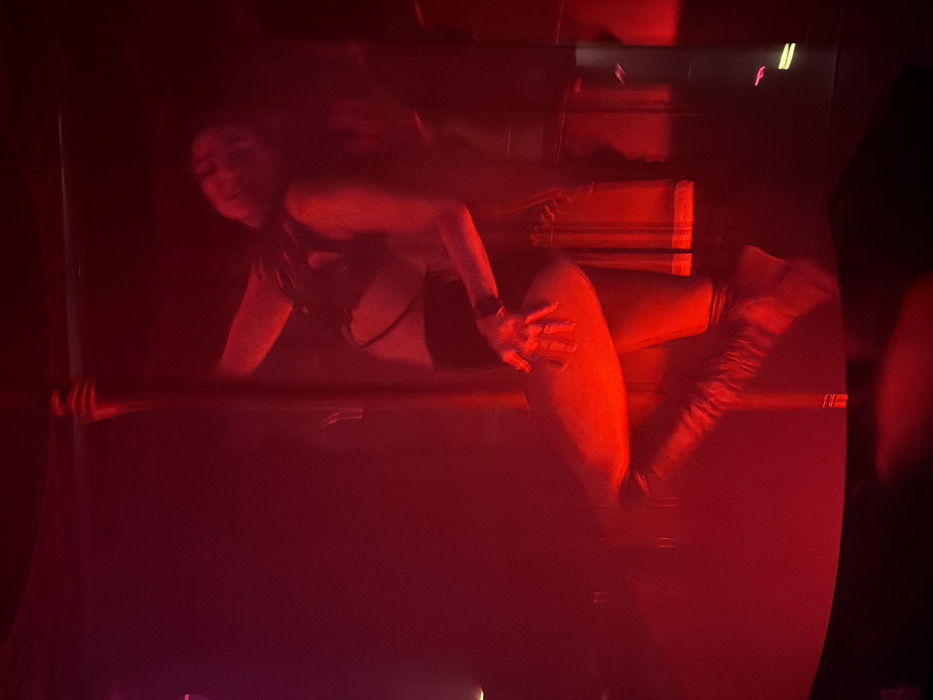The image depicts a single female individual performing on a stage within a dimly lit indoor venue, characterized by pervasive red lighting
