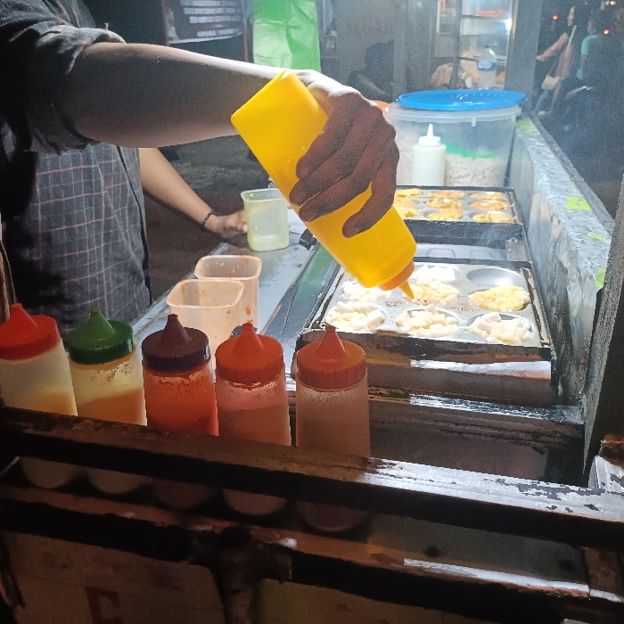 A person is pouring yellow liquid from a bottle into a metal pan filled with small round, white snacks. The person's hand is visible holding the bottle and pouring the liquid. The scene is set in a food stall in Kecamatan Kaliwungu Selatan, Indonesia, with a partially obscured counter, bottles of sauces and condiments, and a metal pan on the counter. The person's torso is partially visible in the foreground, wearing a plaid shirt. The background is mostly obscured by shadows, with a blurry figure standing in the distance. The scene takes place outdoors at night. The bottle of sauce is positioned directly above the pan of food. A person is visible in the distance with their right hand on the counter. Two clear containers are visible on the counter, and there are 5 bottles of various sauces arranged in a line in the foreground.