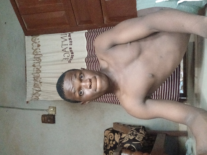 A young, dark-skinned male with short dark hair is captured in a half-length, direct-gaze pose within an indoor residential environment