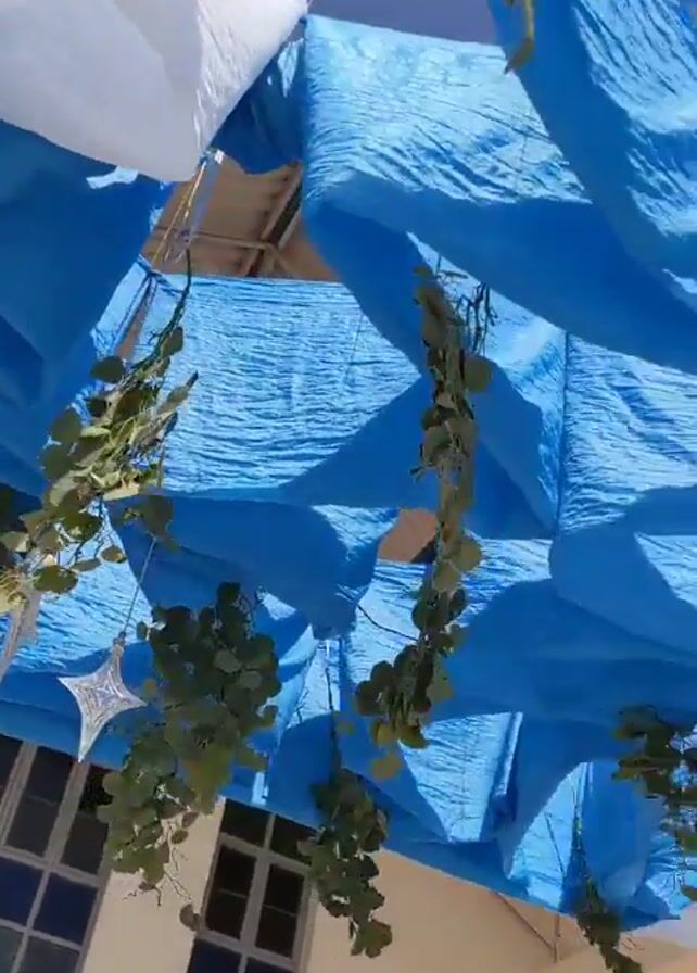 Here is a detailed description of the video: The video shows a decorated outdoor event space with blue and white paper streamers hanging above