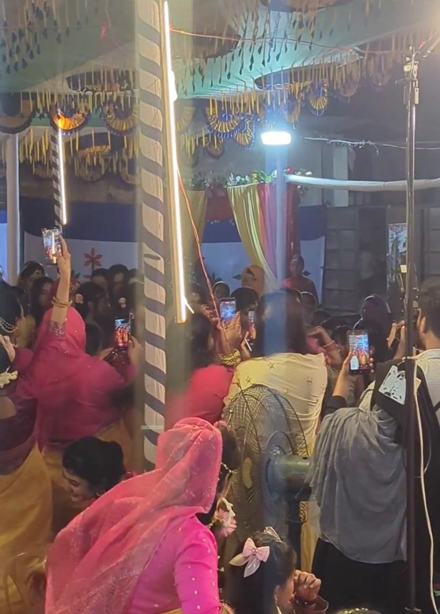 crowd of people at what appears to be a wedding celebration in an outdoor tent. Many people are holding up their phones, likely taking pictures or videos of the event. Most of the women are wearing colorful traditional South Asian clothing, predominantly pink and yellow saris. There is a young girl in the front with a jeweled headband. A large fan is visible, likely to keep people cool in the crowded space. The tent is decorated with blue and yellow streamers, and multi-colored curtains. Overhead lighting is present.