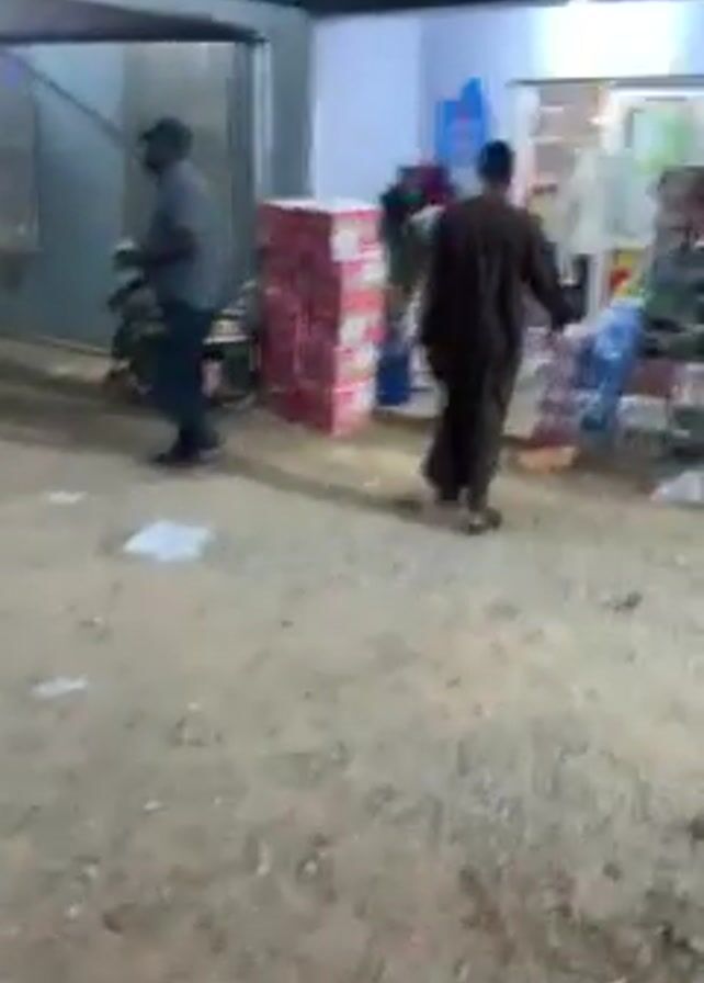 n outdoor scene near a small store or shop. Three men are visible. One man is wearing a grey shirt and black pants, standing next to a generator and holding a long pole. Another man, wearing a brown robe-like garment, is walking towards the store. A third man, wearing a white shirt and dark pants, is standing inside the store. Stacks of red cardboard boxes are visible outside the store, along with various other items like bottled water and assorted goods. The ground appears to be dirt or gravel. The store has a white exterior with an awning. Overall, the scene appears somewhat cluttered and possibly taking place at night or in low light.