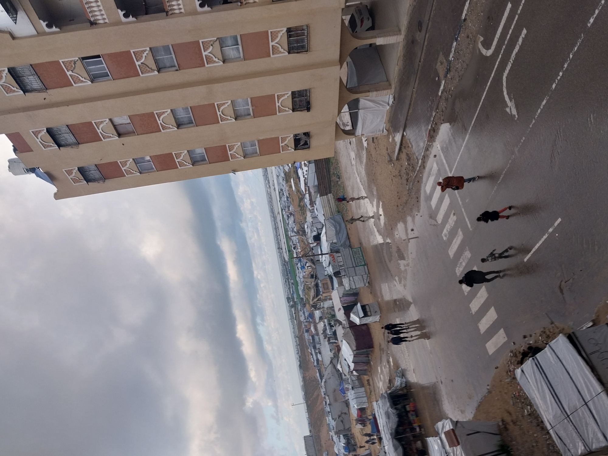 An elevated view captures a street scene in Khan Yunis, Palestinian Territory, under an overcast sky with heavy clouds. The ground is wet with numerous puddles, indicating recent rain. To the right, a multi-story, light beige building with reddish-brown vertical panels and decorative white window frames dominates the foreground. Its ground floor features an open archway design, under which a white sedan is parked and white tarpaulin covers are present. Windows on the building are visible, some fitted with dark security grates. A white water tank is on the building's roof. To the left and stretching into the background, a sprawling encampment of temporary shelters is visible, consisting of various tents, tarpaulin structures, and makeshift dwellings. This tent city extends across a muddy, uneven landscape towards a distant horizon. Small figures are discernible moving within the camp. In the mid-ground, a dark asphalt road, wet from rain, runs horizontally. It features white painted markings, including a clear crosswalk (zebra crossing) and a white right-turn arrow. Puddles are scattered across the road surface and adjacent muddy areas. Several individuals are present on the road and nearby ground. In the immediate foreground on the road, a person in dark clothing walks left on the crosswalk, with a child in a plaid shirt trailing behind, walking right. Further right on the road, another person in a brown jacket walks right, and a person in a dark top and red pants walks left. Three men in dark clothing are observed walking together amidst puddles near the edge of the tent city in the mid-ground. Other smaller figures are seen walking within the distant parts of the tent encampment. Debris and muddy patches characterize the unpaved areas surrounding the tents and road.