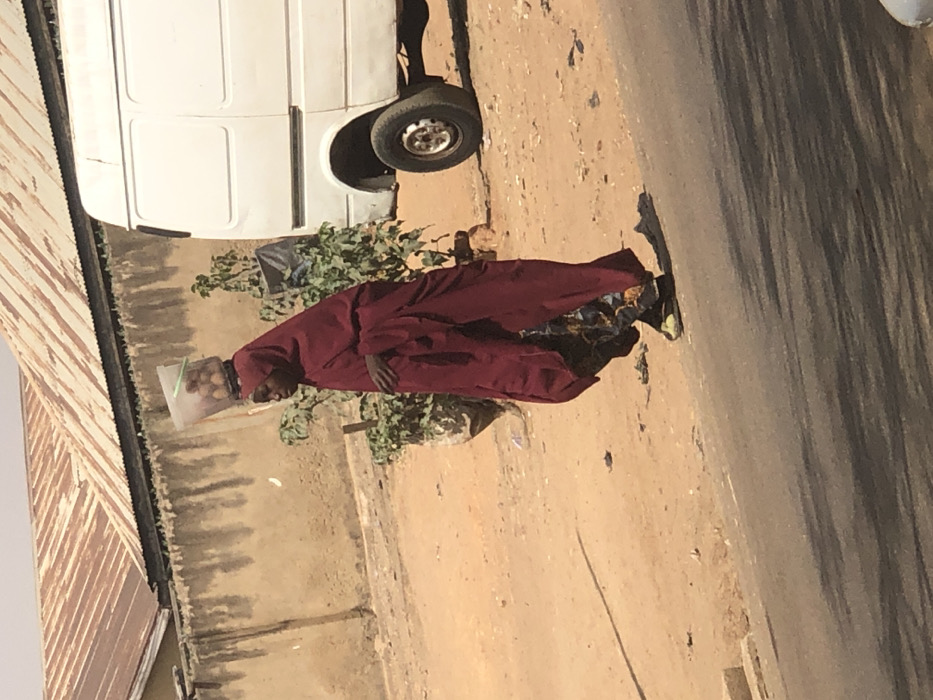 In the city of Tukur Tukur, Nigeria, a female individual is observed in profile, moving from left to right along a dirt shoulder adjacent to a paved road. She wears a dark red, full-length outer garment over patterned trousers and dark sandals with a lighter sole. A transparent plastic bucket, filled with several round, orange-colored fruits, is balanced on her head. Her left arm is bent at the elbow, with the hand partially visible. The background displays a light brown, textured wall. Beyond the wall, multiple corrugated metal roofs are discernible. A white panel van is parked on the dirt to the right of the subject, its rear wheel and side panel visible. Green foliage is present near the wall. Long, diagonal shadows are cast across the paved road from the right, indicating direct sunlight.