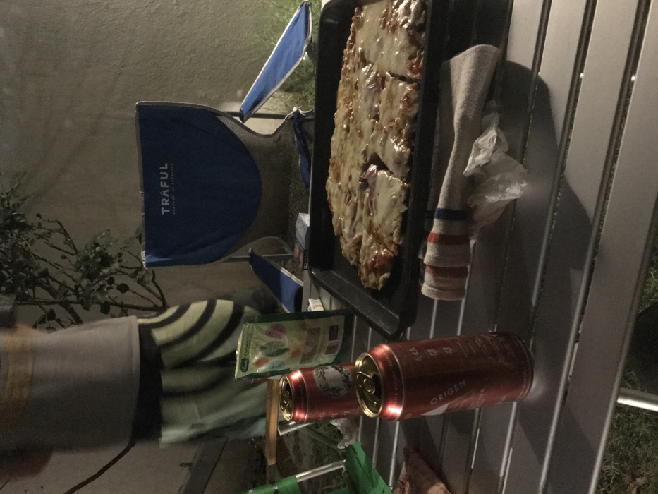 A partially eaten pizza on a metal tray, a striped towel, and an "Origen" beer can rest on a metal rack. Nearby, there is a blue and grey camping chair with the word "TRAFUL" visible. A green and white package lies near the can, and a small green object is at the bottom. The scene appears to be outdoors, with foliage in the background.