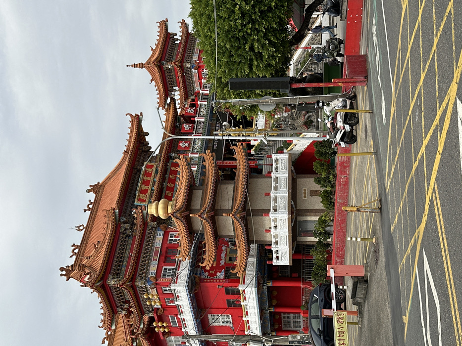 A multi-tiered red and orange traditional building dominates the view, featuring intricate roof details. The structure includes windows and decorative elements. Adjacent to the building is an area with yellow cross-hatched parking lines, a parked car, and scooters. A tree and red posts border the parking area. The scene appears to be set in an urban environment under a cloudy sky.