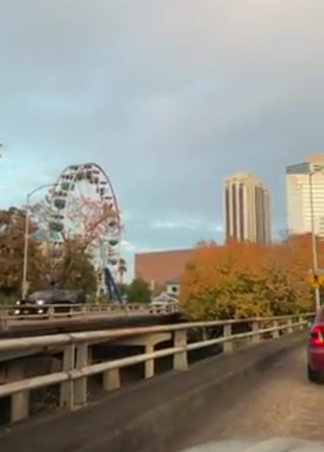 view of a cityscape from a car driving on a bridge. There are several tall buildings in the background, including a Ferris wheel. The trees in the foreground have autumn colors. The sky is overcast. Cars are moving in both directions on the bridge.