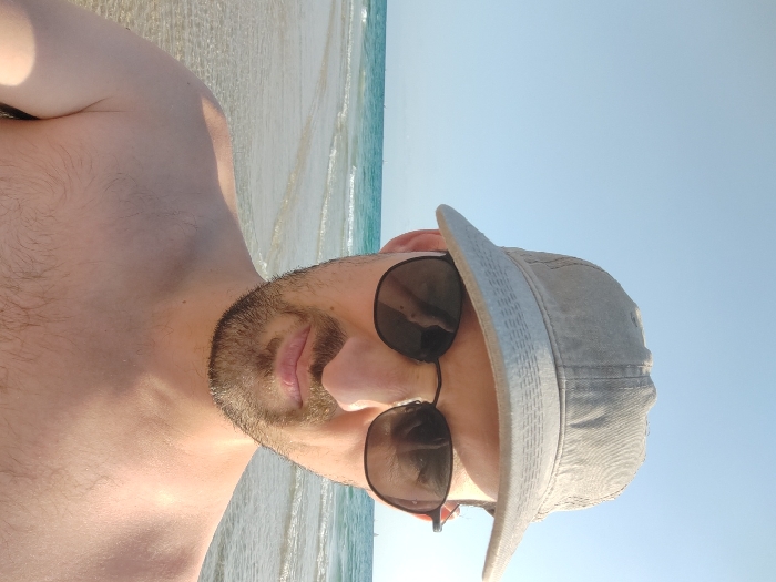 - "An upward-angled, close-up photograph depicts a male subject from the chest up, positioned on a beach in Tel Aviv, Israel, facing the camera" by FM-3Ip2o1, licensed under CC BY 4.0