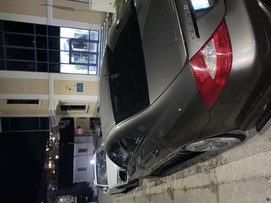 The scene depicts a nighttime urban street in Shumen, Bulgaria. In the immediate foreground, a dark grey metallic Mercedes-Benz CLS 500 (W219 model, indicated by "CLS 500" badging) is parked parallel to a curb on the right side of the frame, facing away from the viewer. The vehicle features tinted rear windows, a subtle trunk lip spoiler, and aggressively cambered aftermarket silver multi-spoke wheels on the driver's side. Its rear lights are visible, with the brake lights off. A partial European Union format license plate is visible. To the left of the Mercedes, a white SUV, possibly an Audi Allroad, is parked facing the viewer, with its headlights illuminated. Further down the street, a red hexagonal "STOP" sign is mounted on a pole, and a dark-colored hatchback, possibly a Volkswagen Golf, is parked nearby. Behind the parked vehicles is a multi-story building with light-colored facade panels and dark-framed windows. A blue sign bearing the name "HERTI" in white text, accompanied by a bell logo, is affixed to the building's exterior. The ground floor of this building features a brightly lit entrance with glass double doors, through which several potted plants are visible. The surrounding environment includes paved street surfaces and an elevated residential area with illuminated buildings visible in the distant background under a dark sky. No individuals or active events are present in the image.