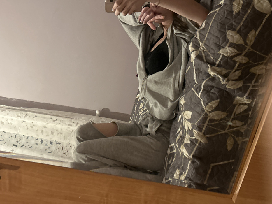 A person is reflected in a mirror. They are wearing a gray sweat suit with a black top underneath. The pants are ripped at the knee. The person is holding a phone. To the right of the person is a large, patterned pillow. The bed beneath the person has a white and light blue cover. The mirror's frame is made of light-colored wood. The wall in the background is a pale purple.