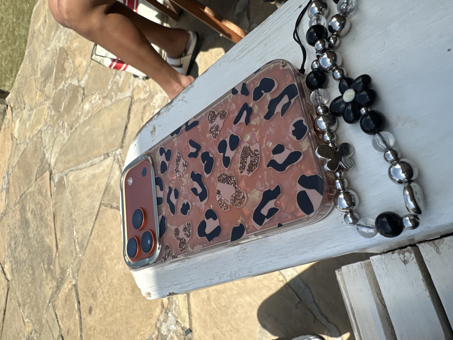 An outdoor scene in Olkaria ward, Kenya, depicts a mobile phone resting on a distressed white wooden surface, likely a bench or table, under bright sunlight. The phone is an iPhone, identifiable by its triple-lens camera array on a reddish-brown module with a metallic gold or silver trim. It is encased in a clear protective case featuring a salmon pink base with black and glittery rose gold leopard print spots. Attached to the bottom of the phone case is a lanyard-style phone charm composed of silver metallic beads (round and oval), black opaque round beads, clear translucent round beads, a silver metallic butterfly-shaped charm, and a black flower-shaped charm with a light-colored center. To the immediate right, a tanned human leg, clad in a white two-strap sandal with a light-colored sole, is visible. This indicates a person is seated nearby. Partially visible behind the leg is an object with red and white stripes, consistent with a chair or bag. The ground surface is paved with irregular flagstones in natural earthy tones. The lighting suggests a clear day with strong shadows.
