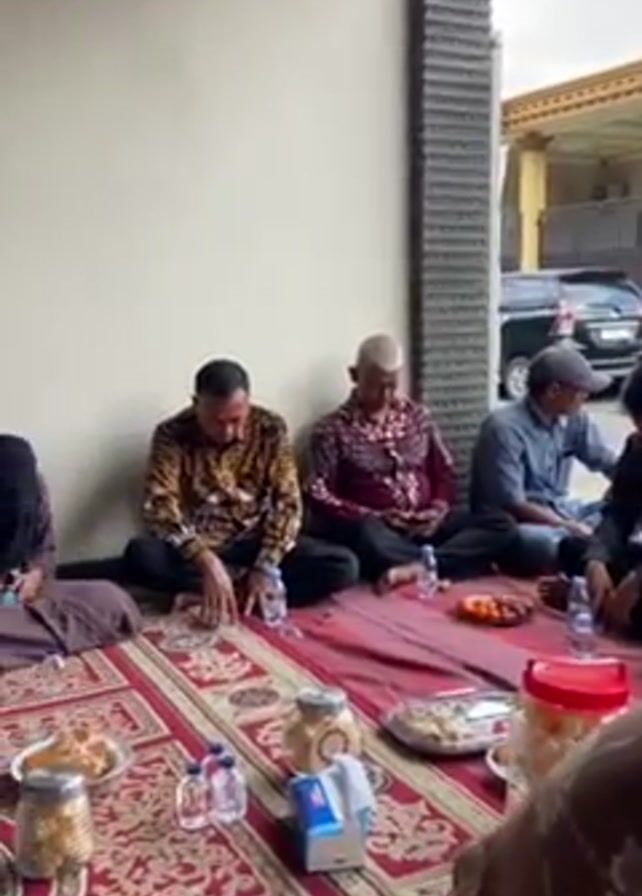 A group of about 15 people, mostly adults, are sitting on a patterned carpet. There are both men and women, some wearing traditional Muslim attire. Several are wearing head coverings. They are gathered around a spread of food and bottled water. A man in a light green shirt is holding a phone and appears to be speaking. The setting seems to be a covered outdoor area or a large porch. There are cars visible in the background.
