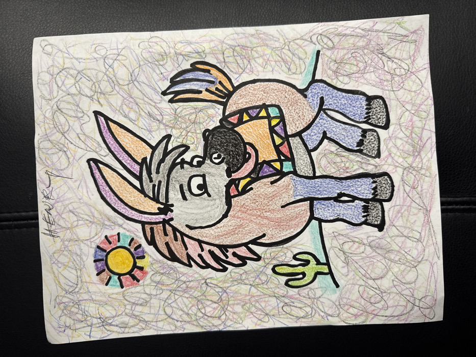 The scene captured is a photograph of a child's drawing, taken in Loganville, United States. The image displays a vertically oriented sheet of white paper, on which a cartoonish donkey or burro is prominently featured. The donkey has a grey head and mane, a brown body, blue legs, black hooves, and pink inner ears. It wears a colorful saddle blanket with geometric patterns in yellow, orange, green, purple, and red. The donkey faces right but turns its head back towards the left, displaying an open-mouthed expression with a pink tongue visible. In the upper left quadrant of the drawing, a stylized sun with a yellow center and multi-colored rays (red, orange, green, blue, purple) is present. A single green saguaro-like cactus stands in the lower left. A light blue line delineates the ground or horizon. The background of the drawing is filled with dense, multi-colored scribbles in hues such as purple, green, red, yellow, and black. The name "HENRY" is written in black capital letters across the top-center of the paper. The drawing is executed using crayons or colored pencils. The paper rests on a dark, textured surface, likely black leather or upholstery, exhibiting visible stitching and contours. The lighting is even, suggesting an overhead light source.