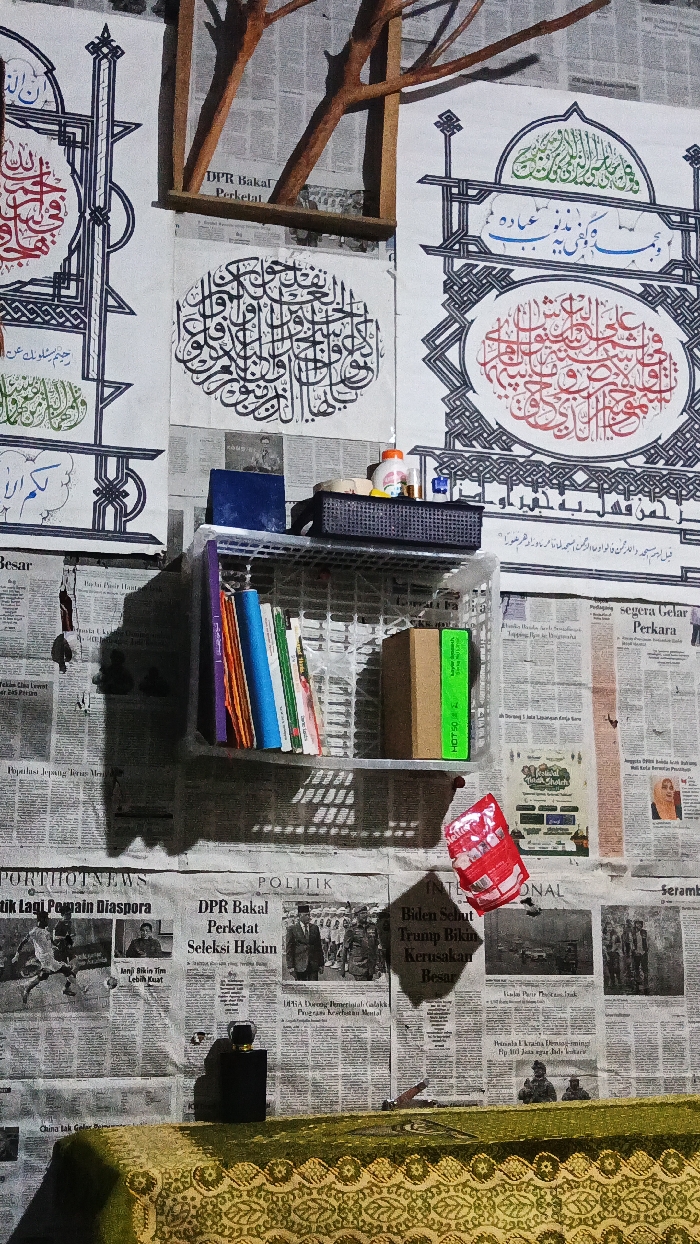 The scene is an indoor wall in Mns Alue, Indonesia. The wall is entirely covered with newspaper pages displaying Indonesian text and images, including headlines such as "DPR Bakal Perketat Seleksi Hakim" and "POLITIK". Affixed over the newspaper background are several large white sheets featuring elaborate Islamic calligraphy in black, red, green, and blue Arabic script. One prominent circular design in black script is centered, flanked by two larger rectangular designs with ornate borders and multiple lines of script. A segmented wooden structure, resembling branches or a makeshift frame, is visible in the upper center, partially obscuring the background. Mounted on the wall below the calligraphy is a transparent, multi-tiered plastic shelf unit. The top tier holds a black rectangular basket, a blue box, and several small bottles, one featuring an orange cap. The lower tier contains a row of books with spines in various colors, including purple, blue, orange, and green, positioned vertically alongside a brown cardboard box with green text that reads "HOT 90 S". A red plastic package is suspended from the right side of the lower shelf tier. At the bottom of the frame, a surface covered with a green and gold patterned fabric, likely a traditional Indonesian textile, is visible. A dark, rectangular object rests on this fabric to the left. The scene is illuminated by a directional light source, casting pronounced shadows from the shelf unit and the hanging package onto the newspaper-covered wall. No individuals are actively present in the immediate scene.