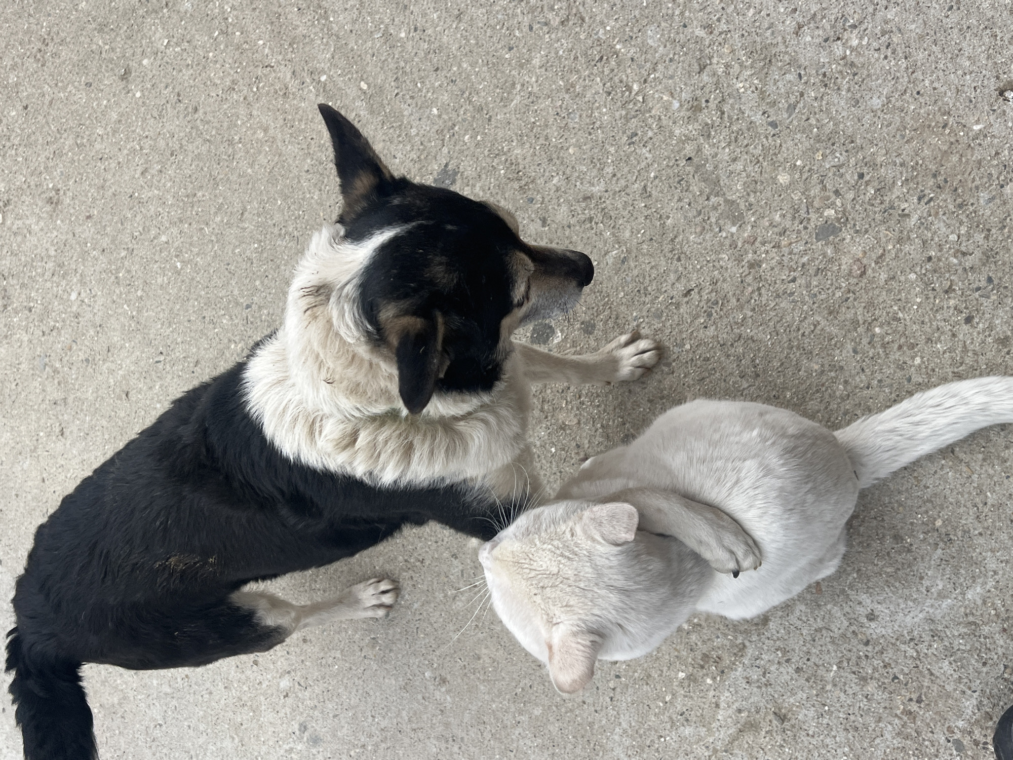 - "An overhead photograph depicts a black and white dog interacting with a white cat on a light grey concrete surface in Kornitsa, Bulgaria" by FM-soC9r1, licensed under CC BY 4.0