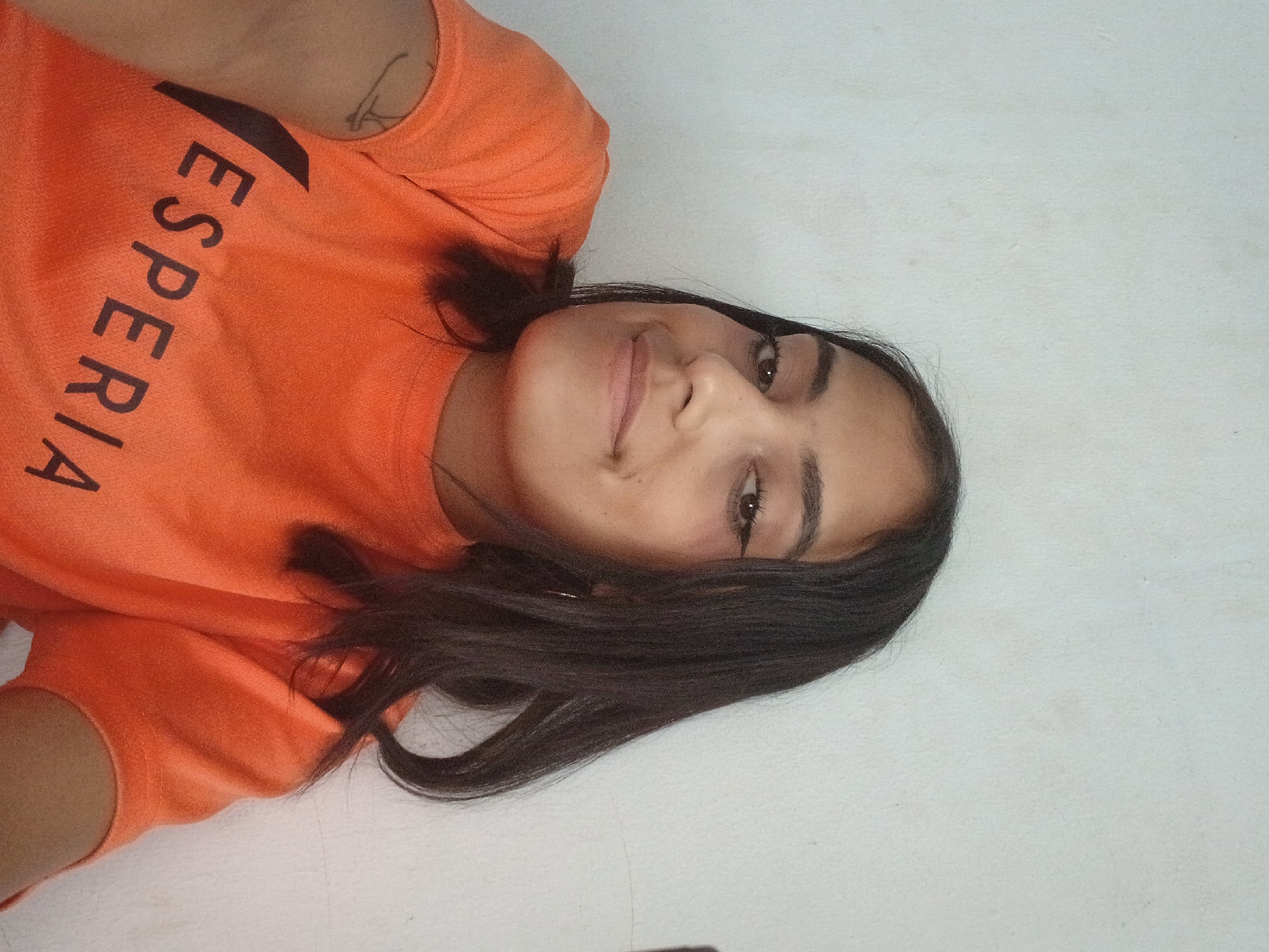 A person with dark hair, wearing an orange shirt with the word "ESPERIA" printed on it, is photographed indoors against a white or light-colored wall