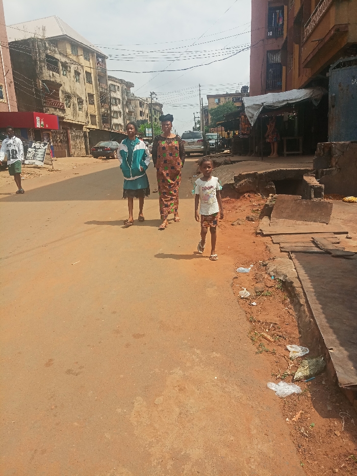 An outdoor scene in Onitsha, Nigeria, depicts a street under an overcast sky