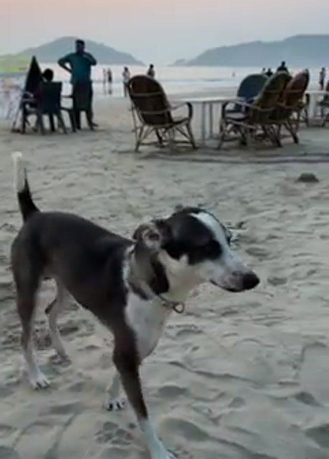 dog with brown, white and black fur walking on a sandy beach. There are people and furniture scattered around on the beach in the background. The ocean, small islands, and a light sky are visible in the background. The dog has a collar and moves steadily forward. As the dog walks, the camera pans to follow, eventually showing huts and tropical foliage bordering the beach.