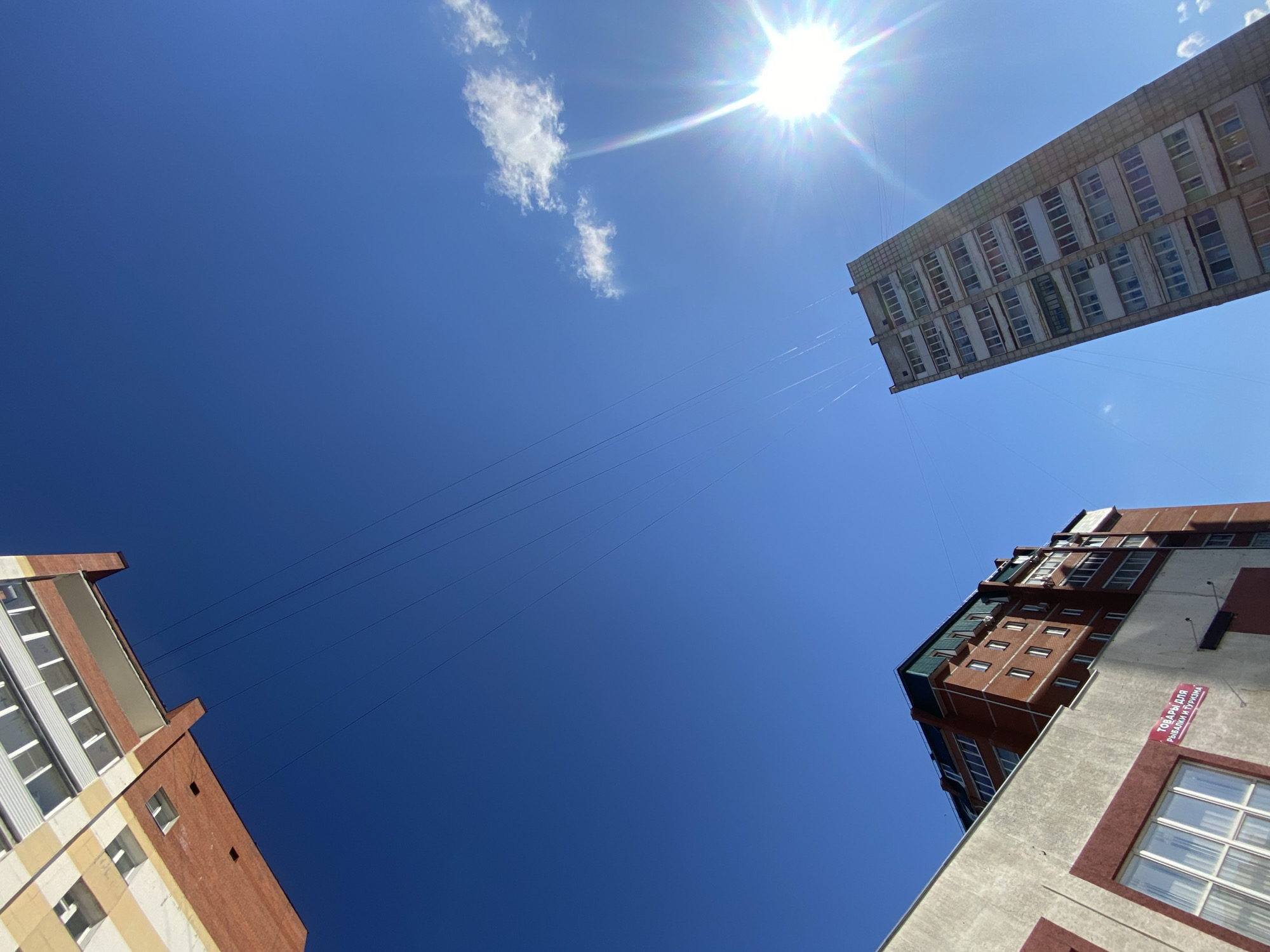 A low-angle photograph, taken in Chaikovsky, Russia, captures four buildings under a clear blue sky with a bright sun. The buildings are positioned at different corners of the frame. The upper right corner features a tall, rectangular building with numerous small windows. The lower right corner shows a building with a mix of concrete and brick, with windows and a sign written in Russian on the side. The building in the lower left corner is primarily brick with light-colored accents and visible windows. Electrical wires run between the buildings, cutting across the sky. A small, puffy white cloud is visible in the upper left portion of the sky, near the sun. The overall perspective provides a sense of urban density and the upward view emphasizes the height of the structures.