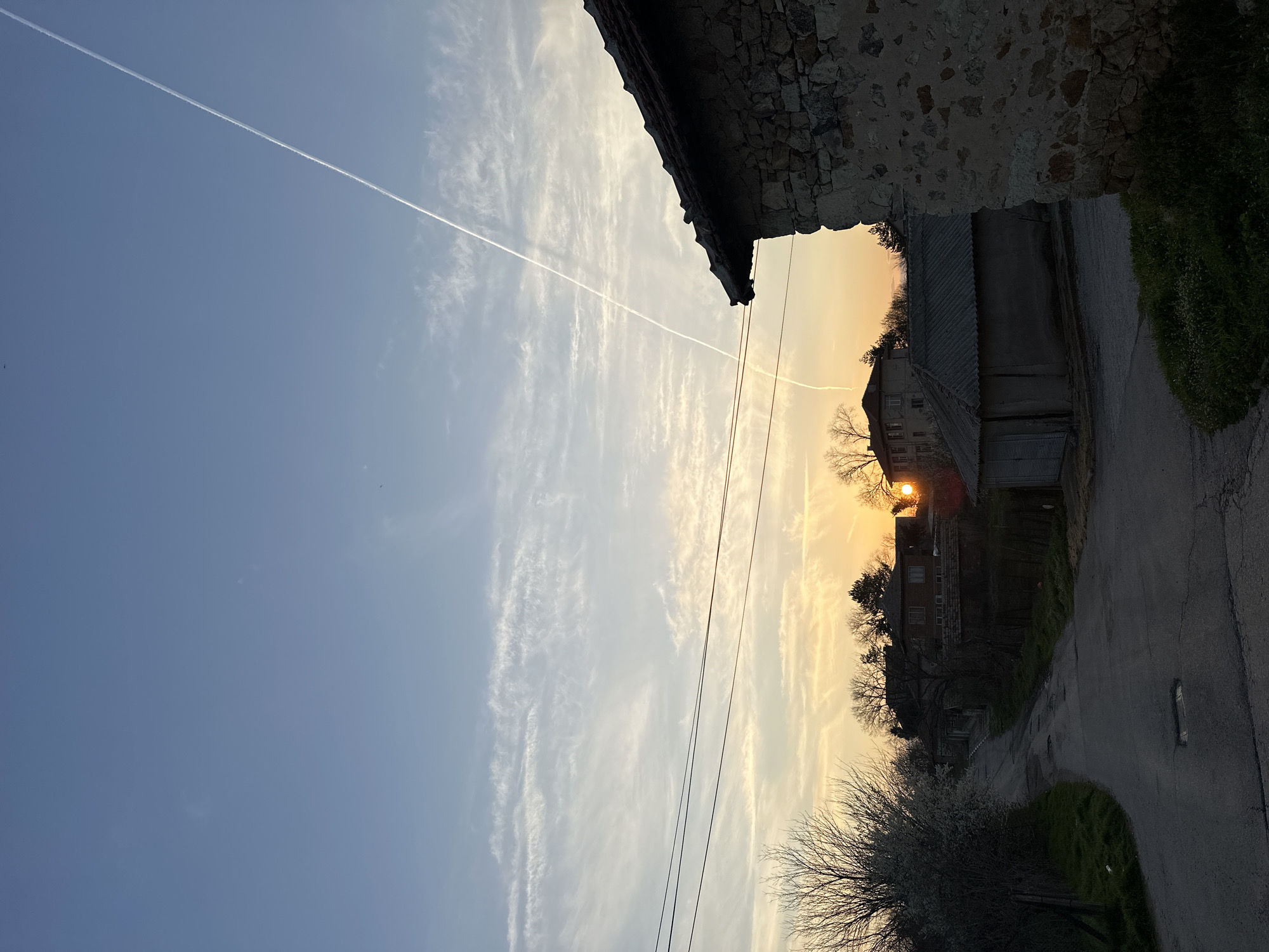 This image captures a sunset scene in Malevo, Bulgaria. The sky transitions from a clear light blue at the zenith to an orange-yellow hue near the western horizon, where the sun is visible as a bright orange orb partially obscured by distant trees and structures. Wispy, streaky clouds are present across the mid-upper sky, illuminated by the setting sun. A prominent, straight white aircraft contrail diagonally traverses the upper right quadrant of the sky. In the immediate foreground, to the right, a section of an aged stone-and-stucco building with a dark-tiled roof is visible. The wall exhibits irregular stonework and deteriorating plaster. Below, green grass covers the ground. To the left, an unpaved or poorly maintained asphalt road with several potholes and cracks curves into the distance. A metal grate is embedded in the road surface in the lower center. Alongside the left edge of the road, a leafless tree or bush with white blossoms is prominent. Further along the road, several village houses are visible. On the left, a multi-story building, likely residential, with a dark roof is partially obscured by trees. In the mid-ground right, a single-story utility building or garage with a grey corrugated roof and closed louvered doors faces the road. Behind it, another multi-story brick house with a dark roof is partially silhouetted against the sunset glow. Bare trees and some evergreen foliage dot the landscape, particularly framing the setting sun. Three dark power lines stretch horizontally across the middle of the frame, supported by poles not fully visible. No people or overt actions are depicted.