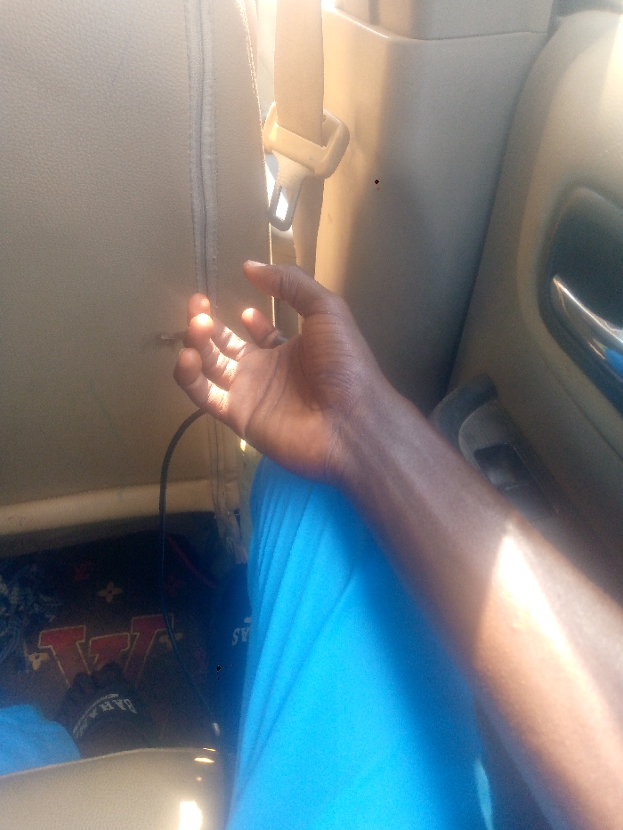 The scene depicts the interior of a vehicle, specified as being in Igede-Ekiti, Nigeria. A dark-skinned human's right arm, forearm, and open hand are prominently visible in the mid-frame, illuminated by direct sunlight. The individual's leg, clad in bright blue fabric, is visible below the arm. To the left of the hand, a beige car seat back is present, featuring a vertical seam and a small tear or scuff. Above and behind the hand, a beige seatbelt and its buckle are visible. The vehicle's interior paneling, also beige, is visible to the right, incorporating a chrome-colored door handle. On the floor, beneath the blue fabric, a dark object, possibly a bag, is partially visible, displaying white text that includes "BAHAMAS" and a red "W" logo on a patterned background. A black cable extends downward from the area near the car seat towards the floor.