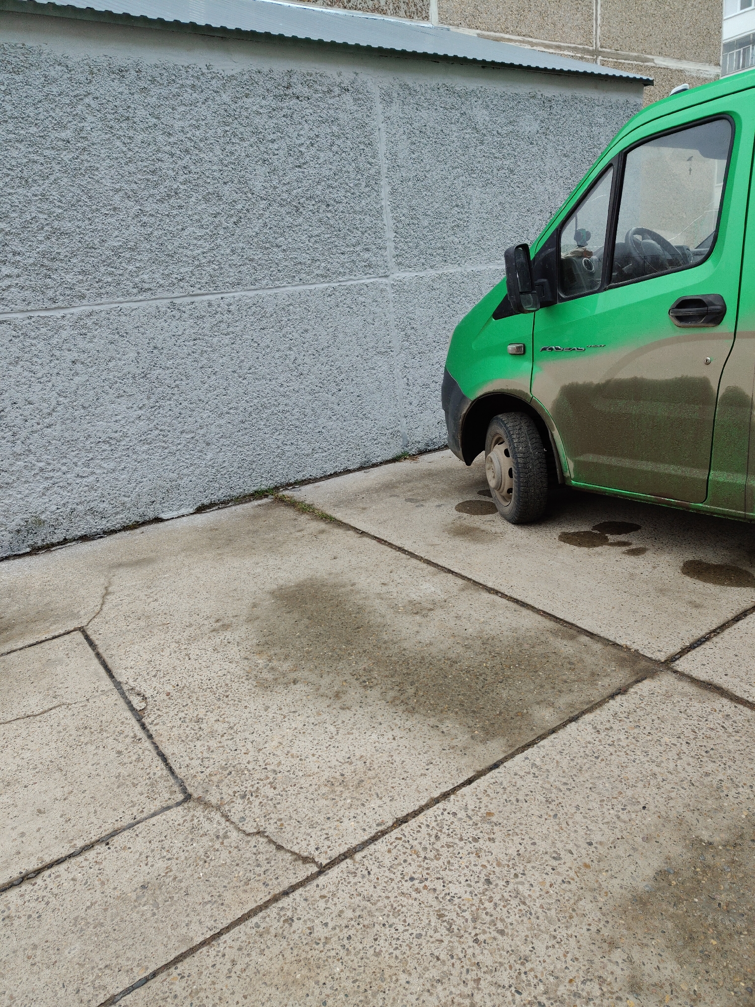 front portion of a green van parked on a concrete slab sidewalk in what appears to be an urban area. The van is visibly dirty, with mud splashed along the side. The front tire is visible. The sidewalk consists of square concrete slabs with visible cracks and stains. A light grey wall is behind the van. The location is identified as the city of Unknown, Unknown.