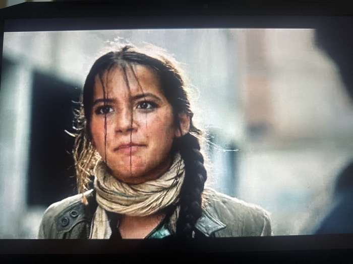 The image presents a close-up, medium shot of a young female subject within an urban setting, specified as Tashkent, Uzbekistan. The subject, appearing to be of East Asian or Southeast Asian descent, faces slightly to her left (viewer's right) with a serious, possibly somber, expression. Her face exhibits multiple dark, vertical streaks, consistent with dirt, grime, or smudged material, particularly visible on her cheeks and across her nose. Her dark hair is styled with a prominent braid extending over her left shoulder, and loose strands fall across her forehead. She wears a light-colored, possibly beige or off-white, scarf wrapped around her neck, under an olive-green or greyish-green jacket that features distinct buttons or snap fasteners on its left shoulder. The background is blurred, depicting indistinct urban structures; a dark vertical form is visible on the left, and lighter, undefined shapes suggest buildings or open space on the right. The overall lighting is bright, with a noticeable sheen on the subject's hair, indicating a potential backlight or strong overhead light source. The image itself shows artifacts consistent with a photograph taken of a digital screen.