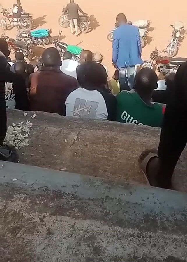 From an elevated, partially obscured vantage point, a ground-level scene unfolds, showcasing a gathering of individuals in an open, sandy terrain. Numerous motorcycles are interspersed among the people. The audience, comprised of multiple individuals with their backs to the camera, are observed sitting on concrete steps, suggesting a stadium-like structure. Distinctly, a man dressed in a blue shirt and dark jeans is seen standing near one of the motorcycles, while others are either standing beside or sitting on the motorbikes. The setting appears to be outdoors under daylight conditions.