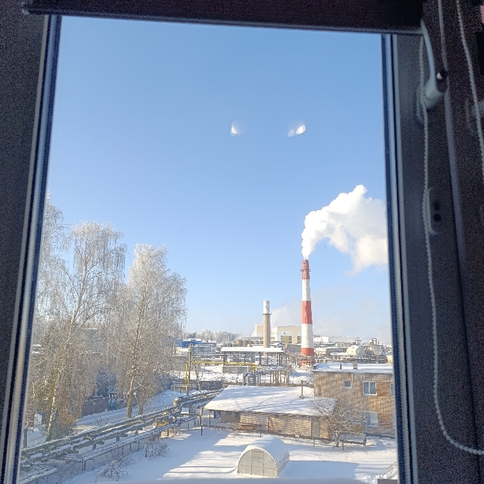 The image depicts an industrial landscape in the city of Hlybokaye, Belarus, observed through a window on a clear, sunny winter day