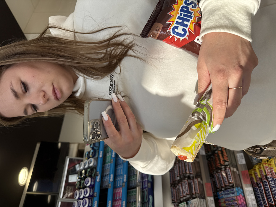 The scene depicts the interior of a retail establishment, likely a convenience store or mini-mart, located in Nikšić, Montenegro. A female subject, appearing to be in her 20s to early 30s with light brown hair and a white hooded sweatshirt, is centrally positioned. She is actively engaged with a light-colored smartphone held in her left hand, which features a decorative camera lens protector. Her gaze is directed downwards toward the phone's screen. Her fingernails are painted white. In her right hand, she holds a partially unwrapped food item resembling a sandwich or wrap, with visible red sauce at one end. A brown bag labeled "CHIPS" in red and blue lettering is tucked under her right arm. The background consists of retail shelving units stocked with various packaged goods, including multiple rows of "Orbit" brand chewing gum and "Snickers" chocolate bars. Overhead artificial lighting illuminates the scene. A dark strap, possibly from a shoulder bag, is visible on the subject's left side.