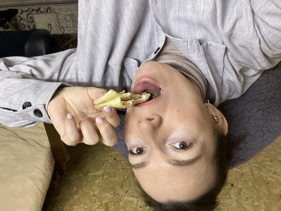 A person in a light gray shirt with a button-down collar is holding a flaky, golden-brown pastry and about to take a bite. The individual has fair skin, brown eyes, and is wearing silver hoop earrings. The background includes a beige-colored cushion, a dark gray surface, and a light brown floor. The picture is rotated, with the person's head pointing downwards.