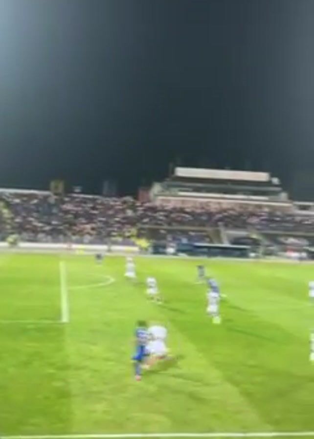 The video captures a soccer game at night from the perspective of a spectator in the stands. The bright stadium lights illuminate the green field, where players in white and blue jerseys are in action. The stands are packed with fans, many of whom are holding up their phones to record the game. Some fans in the foreground are wearing blue jackets. The atmosphere appears lively with sounds of cheering and shouting, although the audio quality is slightly muffled. The focus of the video shifts between the action on the field and the energy of the crowd.