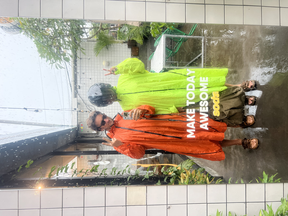 A person in an orange raincoat and sunglasses poses, giving a peace sign, while holding a phone up to a mirror. Reflected above them, someone wears a helmet and neon yellow raincoat, also giving a peace sign. The mirror shows a reflection of a tropical outdoor scene. Text on the mirror reads "MAKE TODAY AWESOME soda." The mirror is covered in water droplets.