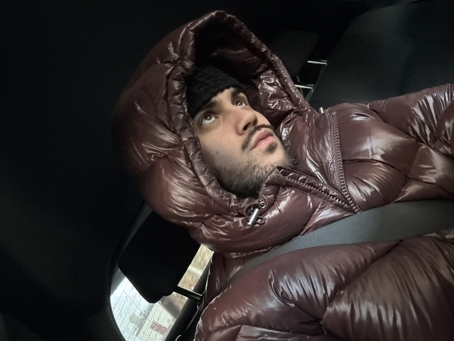 A male individual is depicted seated inside a vehicle, occupying the front passenger seat. He wears a shiny, dark maroon puffer jacket with the hood up, covering a black knit beanie. A dark gray seatbelt is fastened across his chest. The individual has a beard and mustache. His gaze is directed towards the upper right of the frame. The vehicle interior is predominantly dark. Through the window on the left side of the frame, raindrops are visible on the glass, indicating precipitation. Exterior elements are blurred and indistinct, preventing definitive identification of the location within Aubervilliers, France.