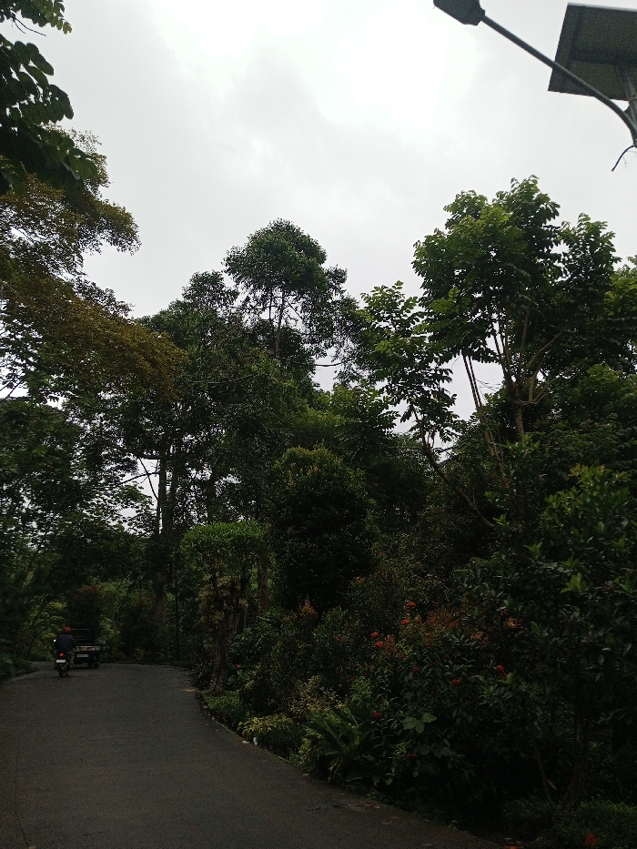 The image captures an overcast daytime scene on a winding asphalt road in Ambakirano, Madagascar. The road appears damp and is flanked on both sides by dense, lush tropical vegetation, including tall green trees and various shrubs, some exhibiting reddish foliage or flowers. A street light fixture, equipped with a solar panel, is visible in the upper right corner. On the left side of the road, a person wearing a dark jacket and a red helmet is operating a motorcycle, moving away from the viewer. Behind the motorcycle, a small, light-colored utility vehicle is also proceeding in the same direction.