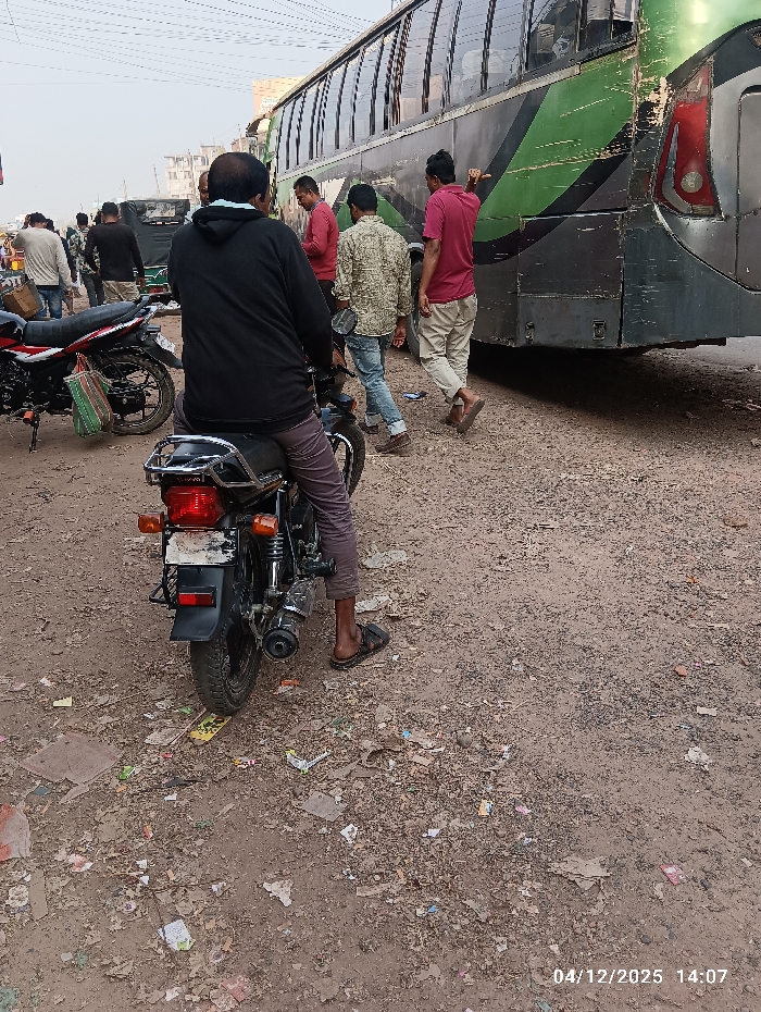 The image displays an outdoor street scene in Kaliganj, Bangladesh, dated 04/12/2025 at 14:07. The ground consists of unpaved dirt and gravel, heavily littered with paper, plastic, and other debris. In the foreground, a male individual is seated on a black motorcycle, facing away from the camera. He wears a dark long-sleeved top, dark trousers, and dark sandals, with a light-colored mask or collar around his neck. His right foot is on the ground. To the left, a second black motorcycle is parked, featuring a green and white striped bag suspended from its side. In the midground, a large, dark green and black passenger bus, exhibiting noticeable dirt and wear, occupies the right half of the frame. Its rear section, taillights, and multiple side windows are visible. Approximately five to six adult males are present near and around the bus. One man, wearing a red shirt and light-colored pants, walks towards the bus with his right arm raised in a gesture. Another man in a patterned long-sleeved shirt and blue jeans is walking away from the bus. A third man in a red shirt stands alongside the bus. In the background, indistinct buildings are visible under a hazy sky, with overhead utility lines traversing the upper portion of the scene. The individuals' actions suggest routine street movement and interaction in proximity to public transport.