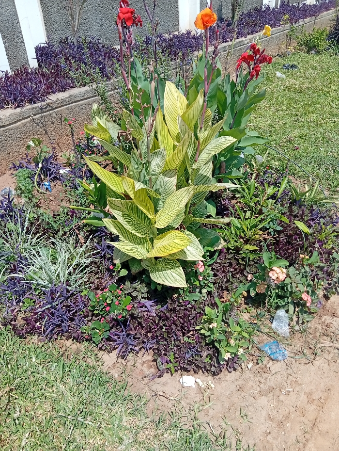 This image depicts a cultivated outdoor flowerbed located in Abuja, Nigeria, illuminated by direct sunlight. The central feature is a large Canna lily plant with variegated green and pale yellow striped leaves. Several taller Canna lily stalks bearing vibrant red and orange flowers extend upwards from this central plant; a single yellow flower is visible further to the upper right. The understory of the flowerbed is densely planted with dark purple foliage, interspersed with various smaller green plants and some with small pink-red blossoms. A distinctive spiky, pale green ornamental plant is positioned on the left side of the flowerbed. The ground immediately surrounding the flowerbed consists of patchy green grass on the left and exposed reddish-brown soil on the right. Scattered on the exposed soil and at the edge of the flowerbed are several pieces of litter, including crumpled blue plastic, clear plastic, and white fragments. In the background, a low, light-colored concrete retaining wall, topped with a strip of dark purple foliage, runs horizontally, separating the flowerbed from a distant building wall with vertical dark accents. No individuals or active subjects are present.