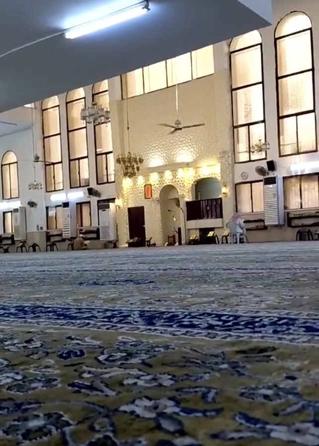 interior of a mosque. The camera is positioned low, close to the carpet, offering a wide view of the prayer hall. The carpet is patterned with a mix of blue, green, and beige designs. Along the far wall, there are several tall, arched windows allowing natural light into the space. The walls are white, and there are decorative elements such as chandeliers and a textured panel behind the mihrab. A ceiling fan hangs in the center. Some furniture and dividers are placed along the walls on either side. One person, dressed in a traditional thobe and headdress, is seated in prayer towards the front.