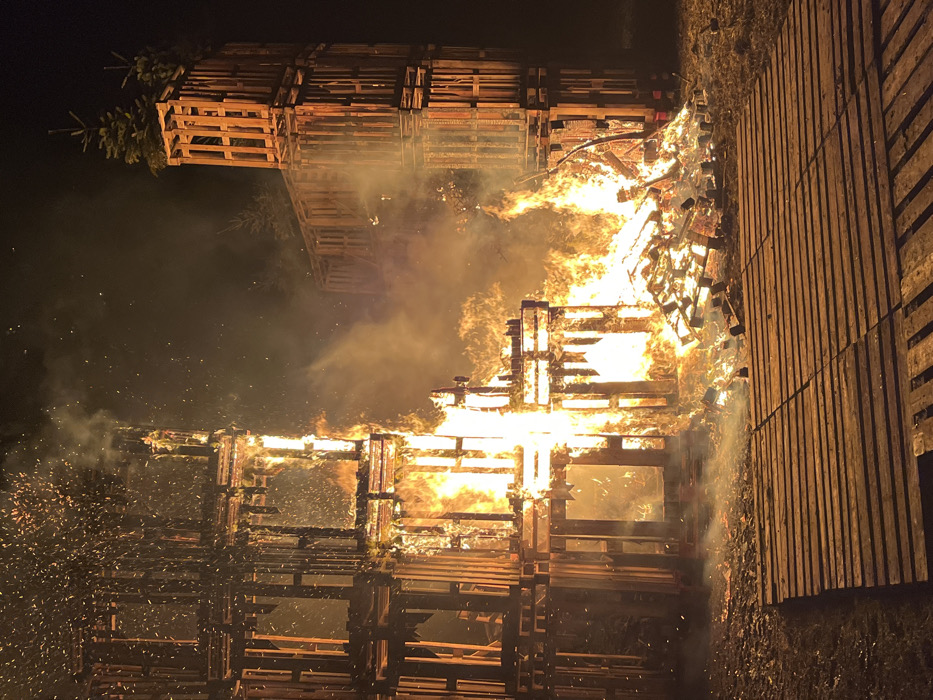 A towering structure composed of wooden pallets engulfed in flames against a dark night backdrop. The fire illuminates the stacked pallets, creating a vibrant orange and yellow glow amidst smoke. To the left, two evergreens appear to top off the construction. Sparks dance through the air, adding a dynamic effect to the intense inferno. Wooden planks are stacked adjacent to the main fire in the right corner.