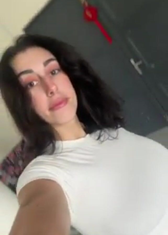 . The video shows a woman standing indoors. She has dark hair and is wearing a tight white T-shirt. She appears to be holding the camera at a high angle and looking directly at the camera. She runs her hand through her hair. A door can be seen in the background.