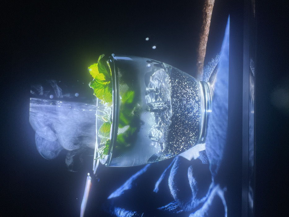 A tilted glass with mint leaves and water against a dark background. The water in the glass is aerated, and vapor emanates from the left side. A brown, branch-like object touches the glass's edge. A blue cloth is partially visible beneath the glass, contrasting with the dark backdrop. The image is framed by dark vertical borders, potentially indicating a screen or window.