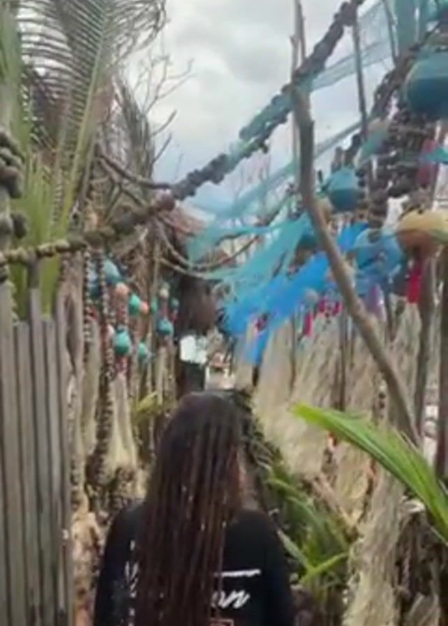 group of four people walking down a narrow path. The path is decorated with various objects, including fishing nets, buoys, shells, and driftwood. The people are walking away from the camera. One person has long dreadlocks, another is shirtless and wearing a backwards baseball cap, another has long blonde hair, and the fourth has long dark hair. The environment appears to be a coastal area, possibly a beach or island setting. The sky is overcast.