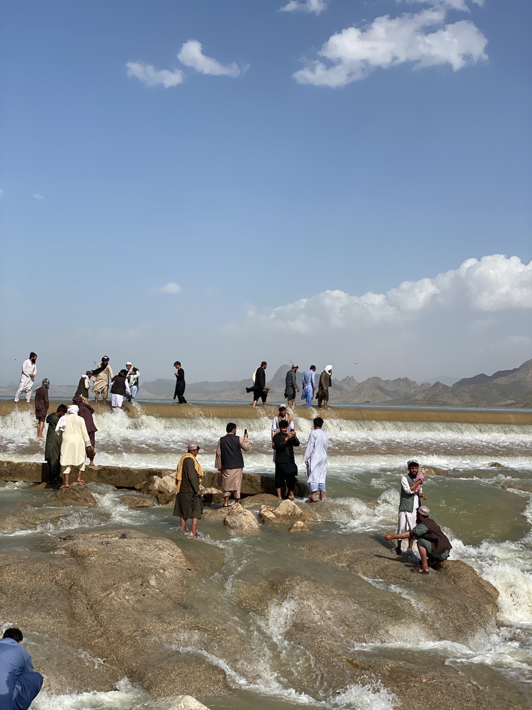 group of men standing in and around a river with a dam-like structure. The location is Kim, Afghanistan. The men are dressed in traditional clothing, including shalwar kameez and turbans. Some are standing on rocks in the river, while others are on the dam. The water is flowing rapidly, creating small waterfalls. Mountains are visible in the background under a partly cloudy sky. Some of the men are taking pictures with their phones.