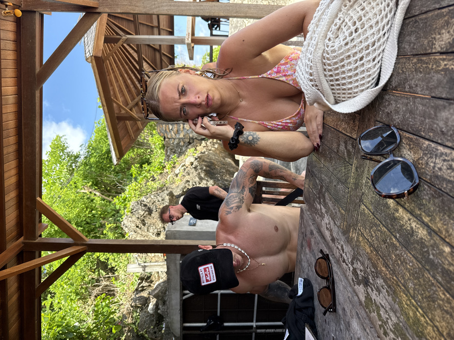 The image depicts an outdoor, sheltered area in Ungasan, Indonesia. Three individuals are present. In the immediate foreground, a blonde woman with sunglasses resting on her head wears a floral bikini top, multiple gold earrings, and a thin gold necklace. She holds a light-colored smartphone to her left ear, engaged in a call, with a serious expression looking towards the viewer. Her right forearm features a circular sun tattoo and a black scrunchie on her wrist. To her left, a shirtless, muscular man with extensive arm tattoos is seated at a worn wooden table. He wears a black baseball cap with a white patch bearing partial text ("BUFFALO, NY") and a white shell necklace. He is looking downwards, and a black folded garment rests near him on the table. On the table between the two, one pair of brown tortoise-shell sunglasses and another pair of dark-framed sunglasses are visible, along with a white net-style bag near the woman. In the mid-ground, a third man wearing sunglasses and a dark t-shirt stands, looking to the right. The background consists of dense green foliage covering rocky terrain under a bright blue sky with scattered white clouds. The scene is set under a wooden pergola with a slatted roof and thick support beams; another similar wooden structure is visible further back on the right.