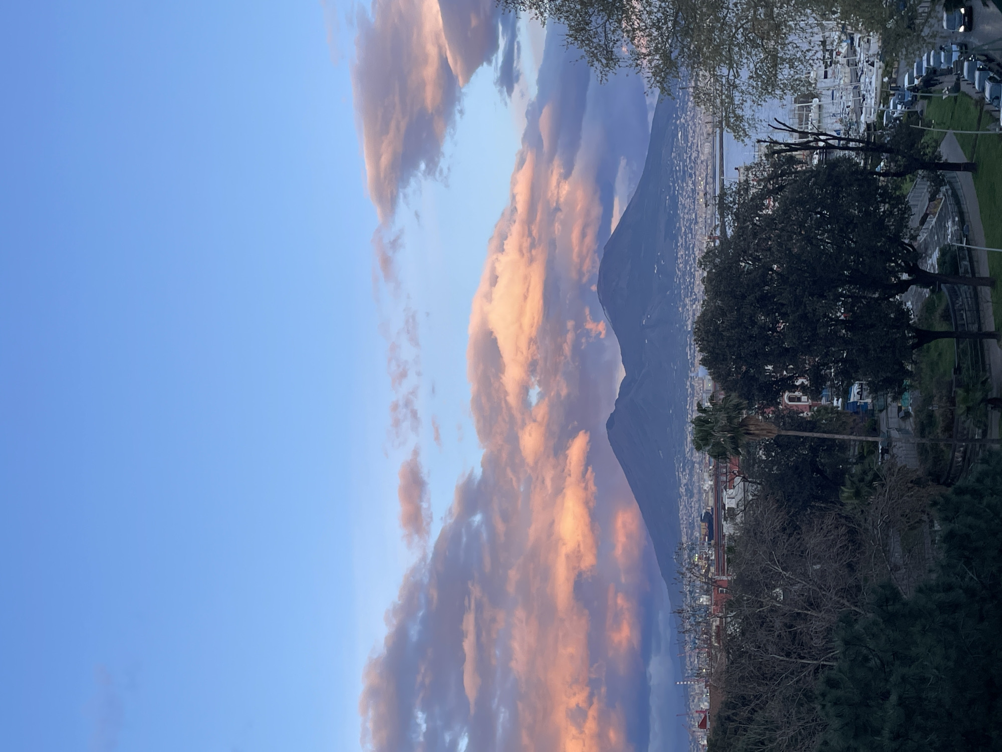 The image presents a panoramic, elevated view of Naples, Italy, at dusk or sunset. The upper half of the frame displays a sky with clear light blue regions transitioning to a deeper blue, punctuated by prominent clouds reflecting vivid pink and orange hues from the low sun. In the mid-ground, the distinctive silhouette of Mount Vesuvius, dark against the colorful sky, dominates the horizon with its two main peaks. Below the volcano, the sprawling urban landscape of Naples is visible, characterized by numerous buildings and structures extending towards the foreground. To the left, industrial elements including cranes and tall chimneys are present, indicating a port area. To the right, a section of the Bay of Naples features a marina densely packed with numerous white-hulled sailboats docked in rows. The immediate foreground consists of a varied canopy of trees: dark green coniferous trees are visible at the bottom left, while several bare deciduous trees with visible branch structures and dense evergreen trees occupy the central and right foreground. A tall, slender palm tree stands vertically on the right side, partially obscuring the view. Below the trees and adjacent to the marina, a street is visible, lined with numerous parked vehicles. Several indistinct human figures are discernible on a sidewalk or path running alongside the street, illuminated by emerging streetlights. The overall lighting suggests twilight conditions, with foreground elements beginning to enter shadow while the sky remains vibrantly lit.