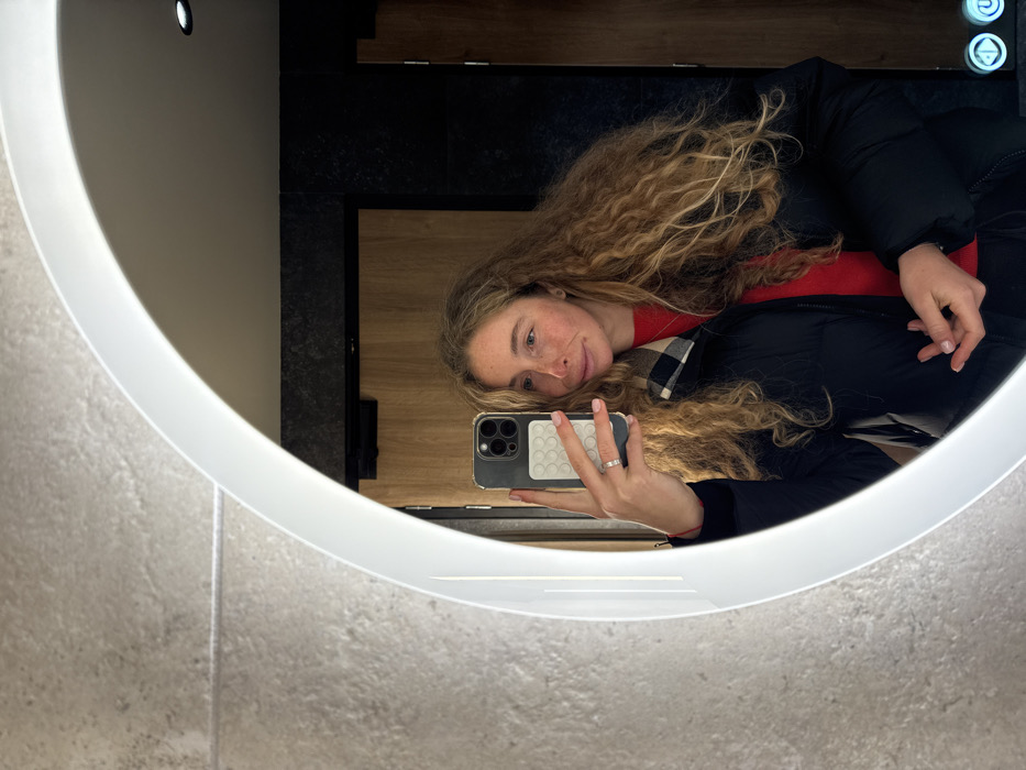 The image depicts a female individual taking a selfie in a mirror within a modern interior setting, located in Annecy, France